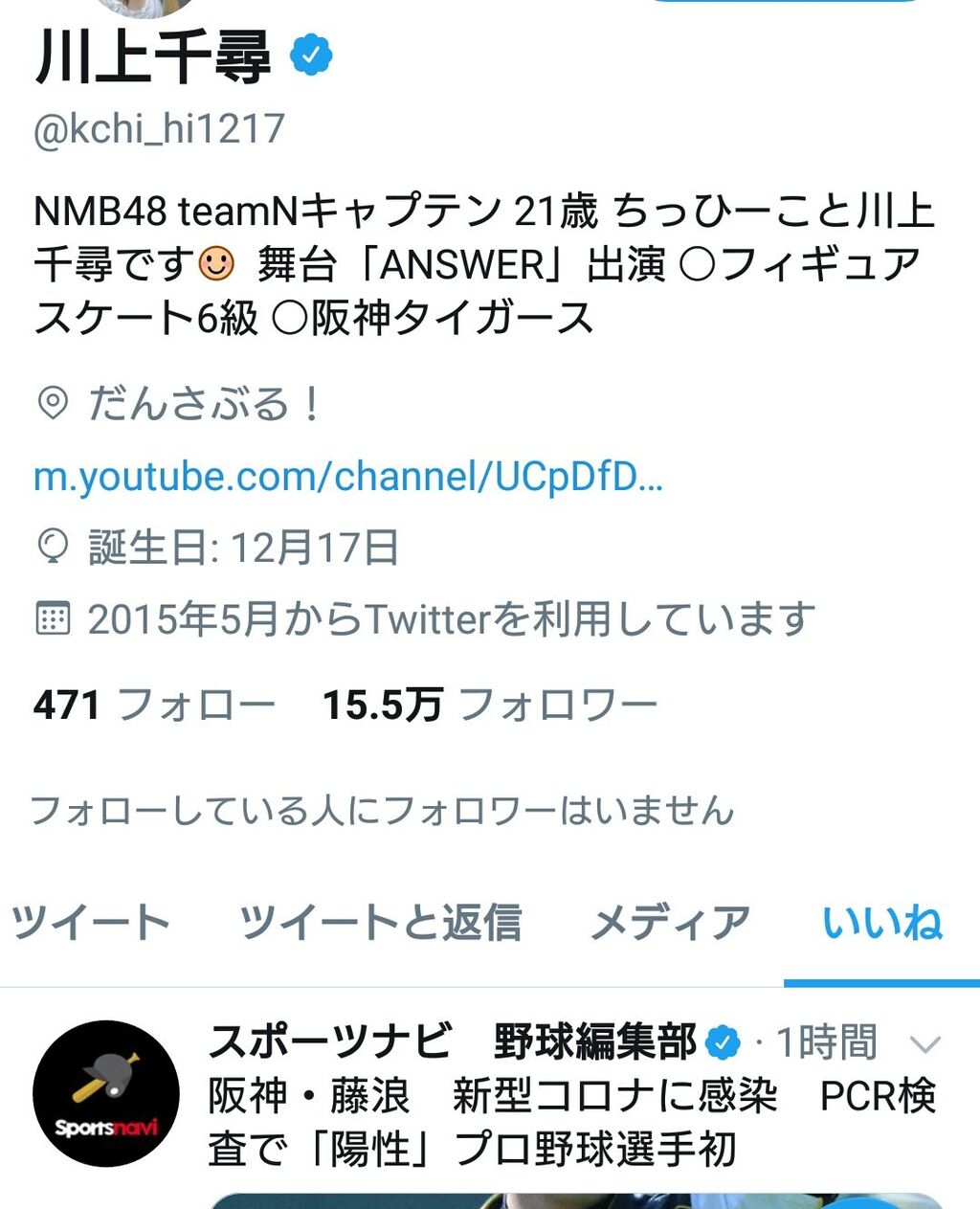 【操作ミス?】NMB48の川上千尋が、阪神・藤浪コロナ感染の記事に「いいね」をつける