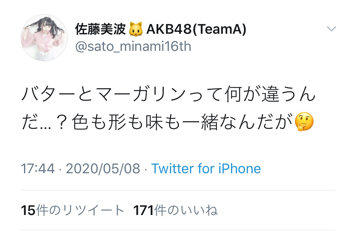 【悲報】AKB48佐藤美波「バターとマーガリンって何が違うんだ…?色も形も味も一緒なんだが🤔」