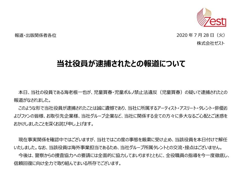 ゼスト「当該役員は海外事業担当であるため、当社グループ所属タレントとの交流・接点はございません」