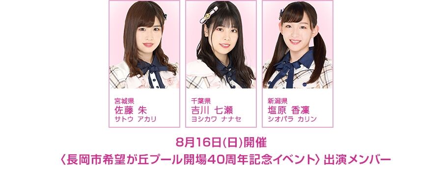 8月16日(日)、長岡市希望が丘テニス場・プール(新潟県長岡市)の屋外プールで行われる〈長岡市希望が丘プール開場40周年記念イベント〉に、AKB48チーム8 佐藤朱、吉川七瀬、塩原香凜が出演します。