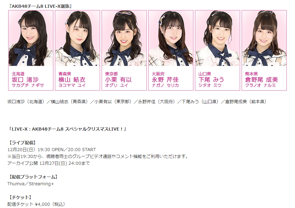 そんな『LIVE-X』に、AKB48チーム8の出演が決定!しかも、今回は、【AKB48チーム8 LIVE-X選抜】によるスペシャルクリスマスLIVE!最先端のバーチャルライブ会場で繰り広げられるクリスマスならではの特別なセットリストは必見!ぜひご覧ください!!