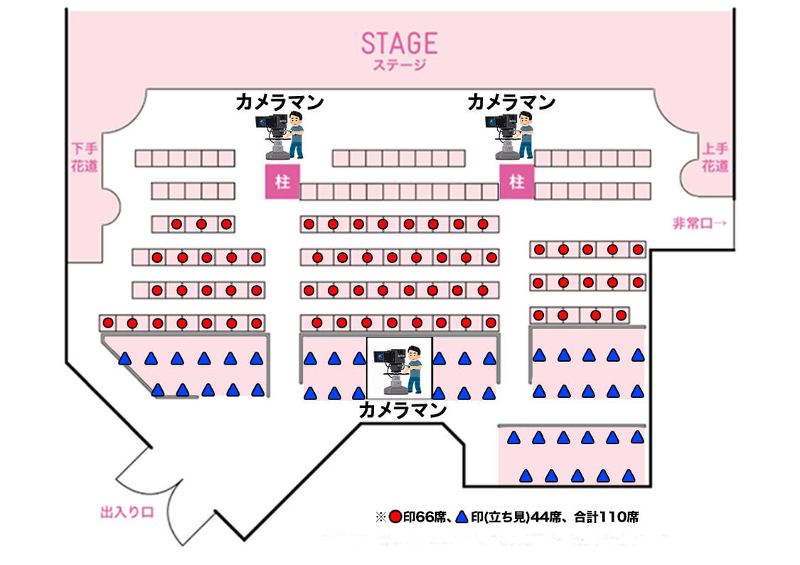 ・前2列の座席は使用中止とさせていただきます(図面参照)。観覧位置は当日の抽選にてご案内させていただきます。