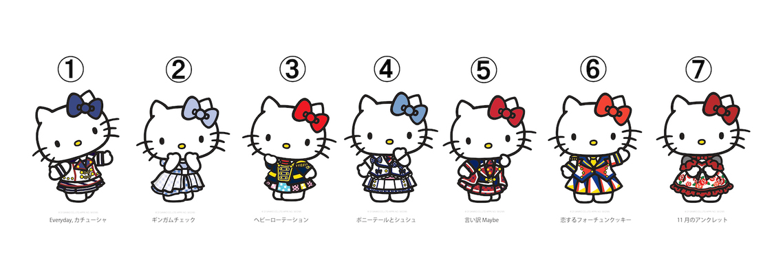 このコラボでは、AKB48の「Everyday、カチューシャ」、「ギンガムチェック」、「ヘビーローテーション」、「ポニーテールとシュシュ」、「言い訳Maybe」、「恋するフォーチュンクッキー」、「11月のアンクレット」の7種の衣装を着たキティちゃんが登場。コラボグッズ計6種の商品を受注販売する。