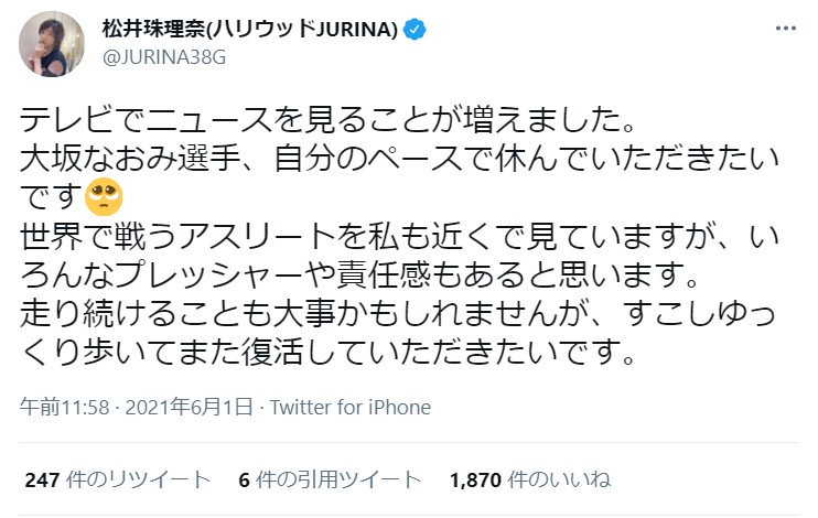 元SKE48 松井珠理奈「大坂なおみ選手、自分のペースで休んでいただきたいです」