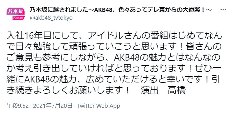 入社16年目にして、アイドルさんの番組はじめてなんで日々勉強して頑張っていこうと思います!皆さんのご意見も参考にしながら、AKB48の魅力とはなんなのか考え引き出していければと思っております!ぜひ一緒にAKB48の魅力、広めていただけると幸いです!引き続きよろしくお願いします!