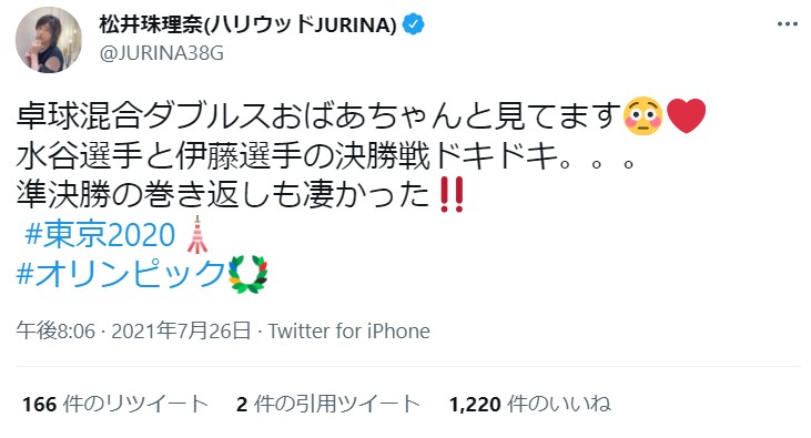 宮脇咲良が出演しているテレビ番組放送中の松井珠理奈さん「卓球見てます。」【東京オリンピック・SKE48・HKT48・IZ*ONE】
