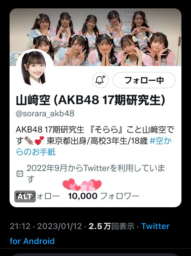 【AKB48】Androidユーザーの17期研究生・山崎空ちゃん、フォロワー10000人達成