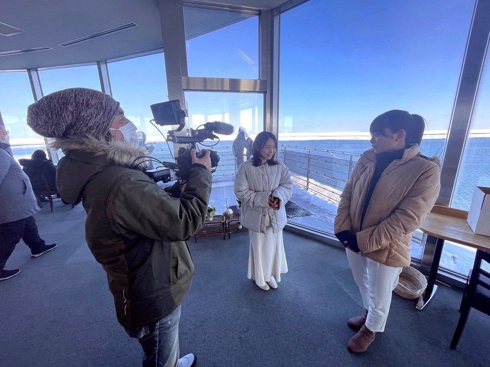 撮影は23日まで、道立オホーツク流氷科学センターや水産加工会社、スナックなどで行われ、紋別の漁師らも出演。2人がホタテやイクラを食べたり、ガリンコ号を見たりするなど紋別の魅力を詰め込む。桜井さんは「紋別は両親と小さい頃に遊びに来ていた思い出の場所」と話し、坂口さんは「流氷を見たのは初めて。紋別の魅力を伝えられるよう頑張る」と意気込む。