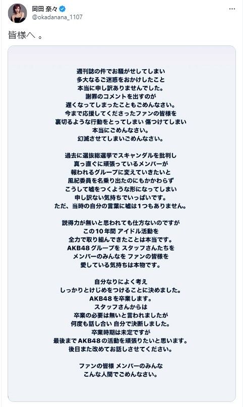 【闇深】AKB48岡田奈々卒業にツイートしてないメンバー