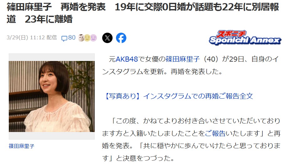 【吉報】元AKB48で女優の篠田麻里子(40歳)が再婚発表!お相手は株式会社ナレッジワークの創業者で代表取締役CEOの麻野耕司氏